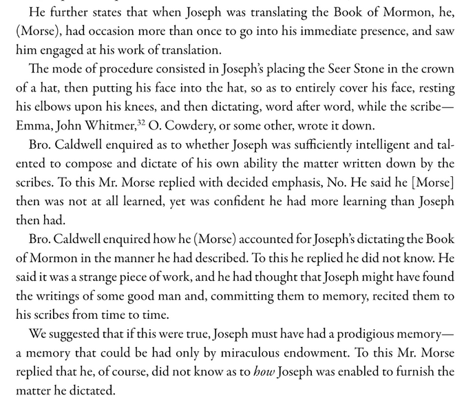 Bro. Caldwell enquired how he (Morse) accounted for Joseph's dictating the Book of Mormon in the manner he had described. To this he replied he did not know. He said it was a strange piece of work, and he had thought that Joseph might have found the writings of some good man and, committing them to memory, recited them to his scribes from time to time.