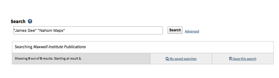 Actually, every search I've tried at the new site has disappointed me. If pinpoint precision for authors and titles cannot bring up the targeted article near the top of a list of results, the manual creation of new links will be more tedious than ever before. My latest target was an article by James Gee, "The Nahom Maps," that was published in the Journal of the Book of Mormon and Restoration Scripture 17/1–2 (2008): 40–57. I began with a search in the Maxwell Institute area for James Gee. There were 14 hits, none of which had any "Gee" as an author or "Gee" in the title. In fact, the word "James" didn't even show up in the names or titles. This is a very unique search engine!