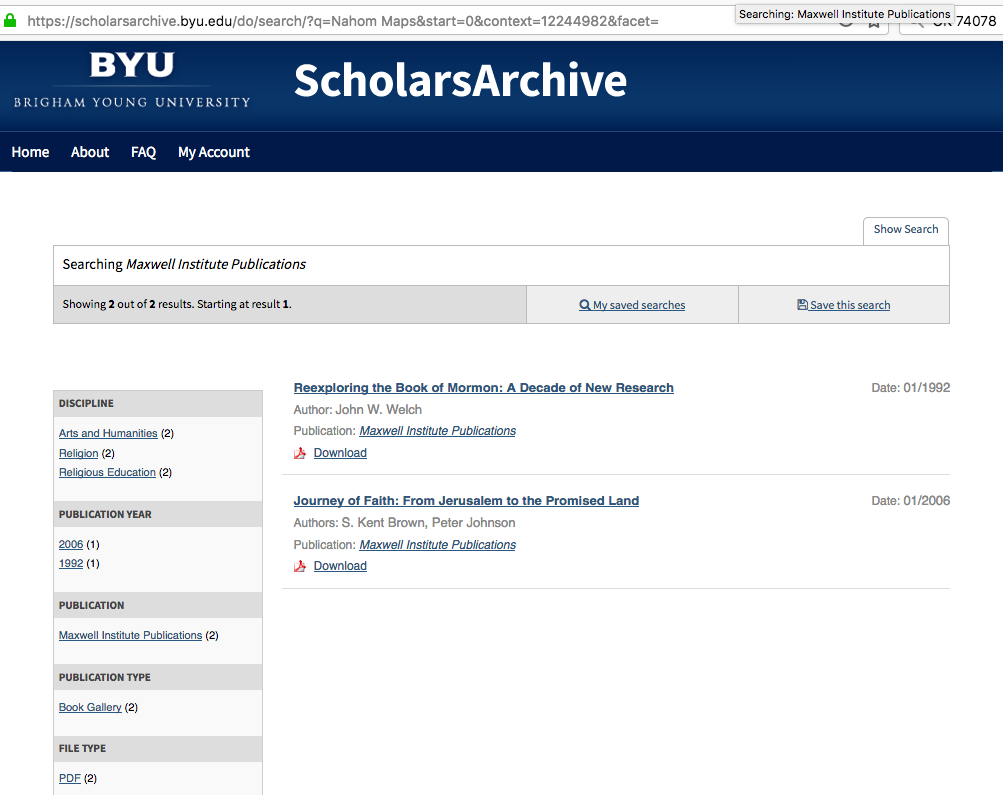 If you start at the page for Maxwell Institute publications, there's no hint that you can browse it's past publications. When you click on the "collections" button, it brings up a long list that includes mostly things unrelated to the Maxwell Institute, except for a link back to the Maxwell Institute page you came from. But you can find past journals if you already know what they are by clicking on Collections > All Journals and then overlooking many unrelated links to select either "Review of Books on the Book of Mormon 1989–2011" (which takes you back to vol. 23 again) or "Journal of Book of Mormon Studies." Nothing about transcripts, multimedia, Insights, and some other items from old days. For someone interested in exploring the past archives of the Maxwell Institute, the interface for browsing just isn't worth much, IMO, though it pains me to say that because I'm sure great people worked hard to build this general tool that serves as a general way to archive stuff. It's just not a great way to browse and explore information the way a specialty website like the old MI site was. That's why a library' archive system is not a suitable replacement for what I believe the Maxwell Institute's site was once meant to be: a light to the world that could help those interested in learning more about the Gospel to find and enjoy valuable scholarly material. There are still photons there, but it takes a lot of effort to release them from their new vault. Which brings me now to an update on the search issue.