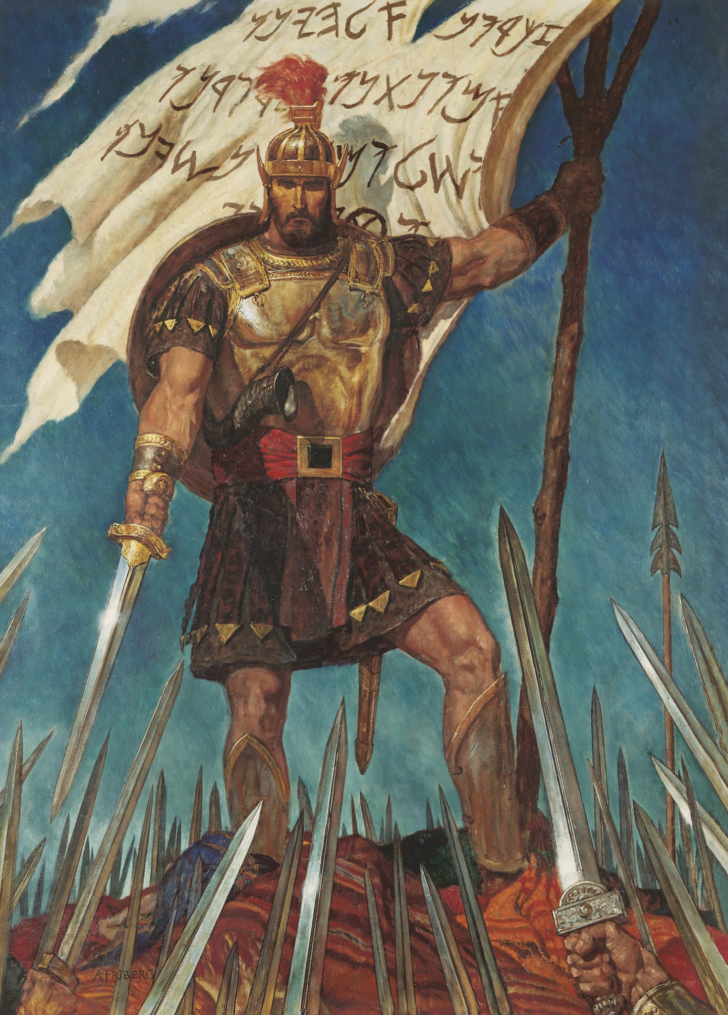 Captain Moroni Raises the Title of Liberty (Captain Moroni and the Title of Liberty), by Arnold Friberg (62051); GAK 312; GAB 79; Alma 46:10–37 Accessed August 9, 2020 from https://www.churchofjesuschrist.org/media/image/captain-moroni-title-liberty-82ae654?lang=eng The following two scripture passages describe similar situations but at different time periods in Nephite history. Captain Moroni, the leader of all the Nephite armies, caused dissenters to be put to death if they would not support their government as well as the freedom and liberties it bestowed on them. |
